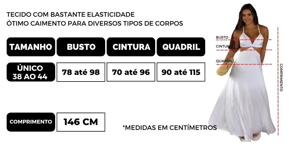 Descrição Completa: O Vestido Longo Branco em Fluity de Poliamida é um clássico de elegância e frescor. Com um decote profundo em “V”, alças finas ajustáveis e amarração nas costas, ele oferece ajuste perfeito e um toque delicado. A abertura frontal e o tecido fluido proporcionam leveza e movimento, ideal para destacar a feminilidade em qualquer ocasião. Seja para eventos diurnos, festas sofisticadas ou momentos especiais, este vestido é a escolha perfeita. Disponível em tamanho único, veste confortavelmente do 36 ao 42.